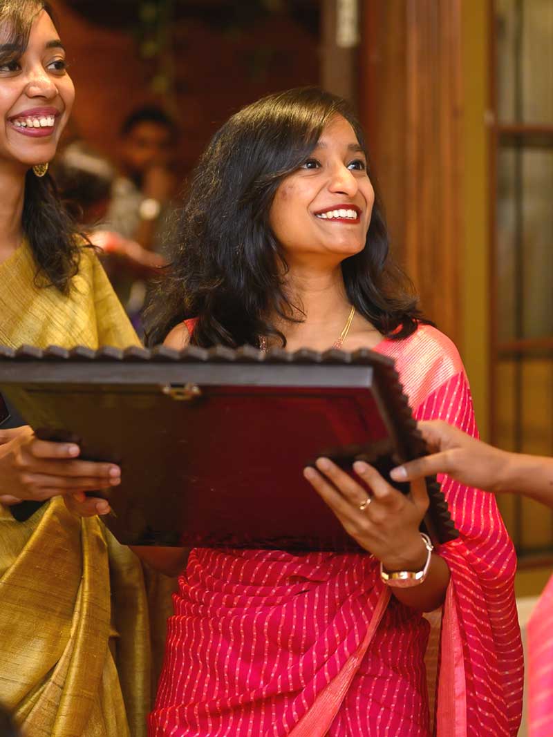In addition to teaching, Spurthy GB oversees the learning journey, working with the team to coordinate classes and artworks. Her creative, approachable and organised approach helps students immerse themselves in Tanjore painting.